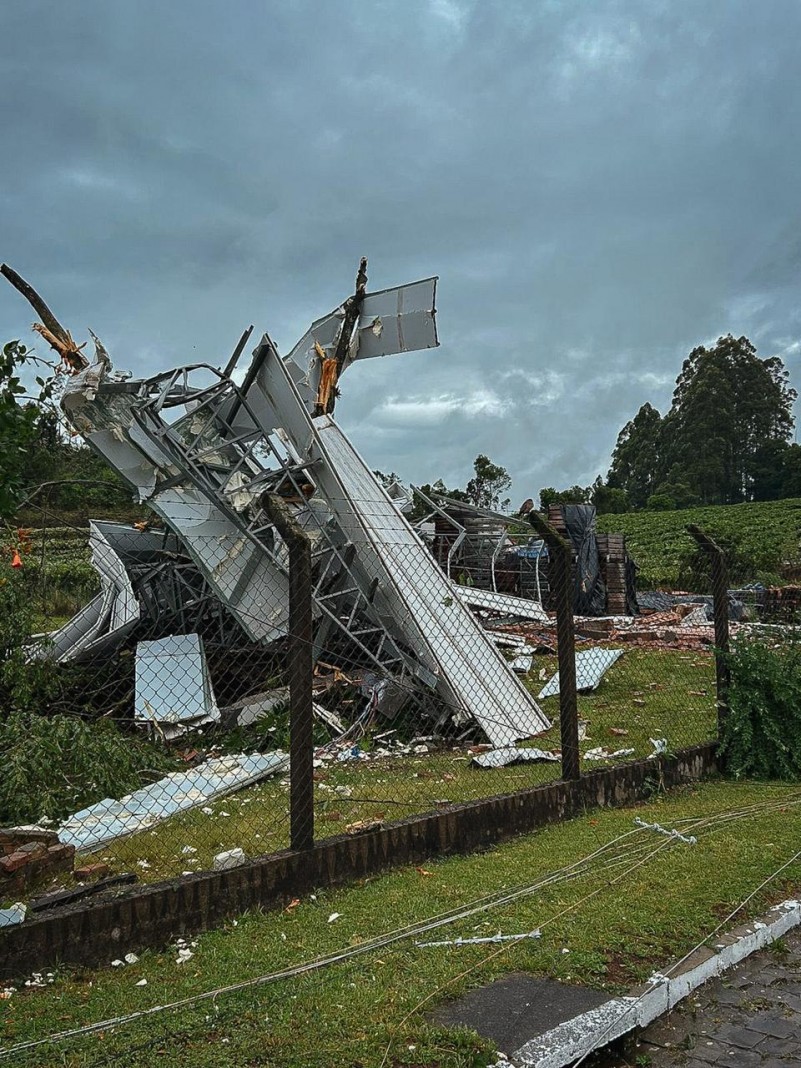 As imagens aéreas dos danos na comunidade de Alfredo Chaves, interior de Flores da Cunha, mostram que a localidade foi atingida por um tornado. O padrão de danos indica que os destroços foram jogados em diferentes direções, o que caracteriza o fenômeno.